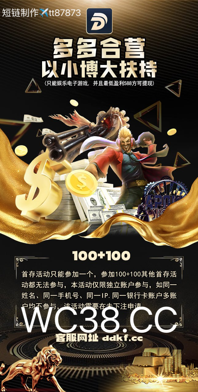 旺财: 100+100(只能娱乐电子游戏,井且最低盈利588方可提现)首存活动只能参加一个参加100+100其他首存活动都无法参与,本活动仅限独立账户参与,如同一姓名、同一手机号、同一IP.同一银行卡账户多账户均不参与,该活动需要在未下注申请