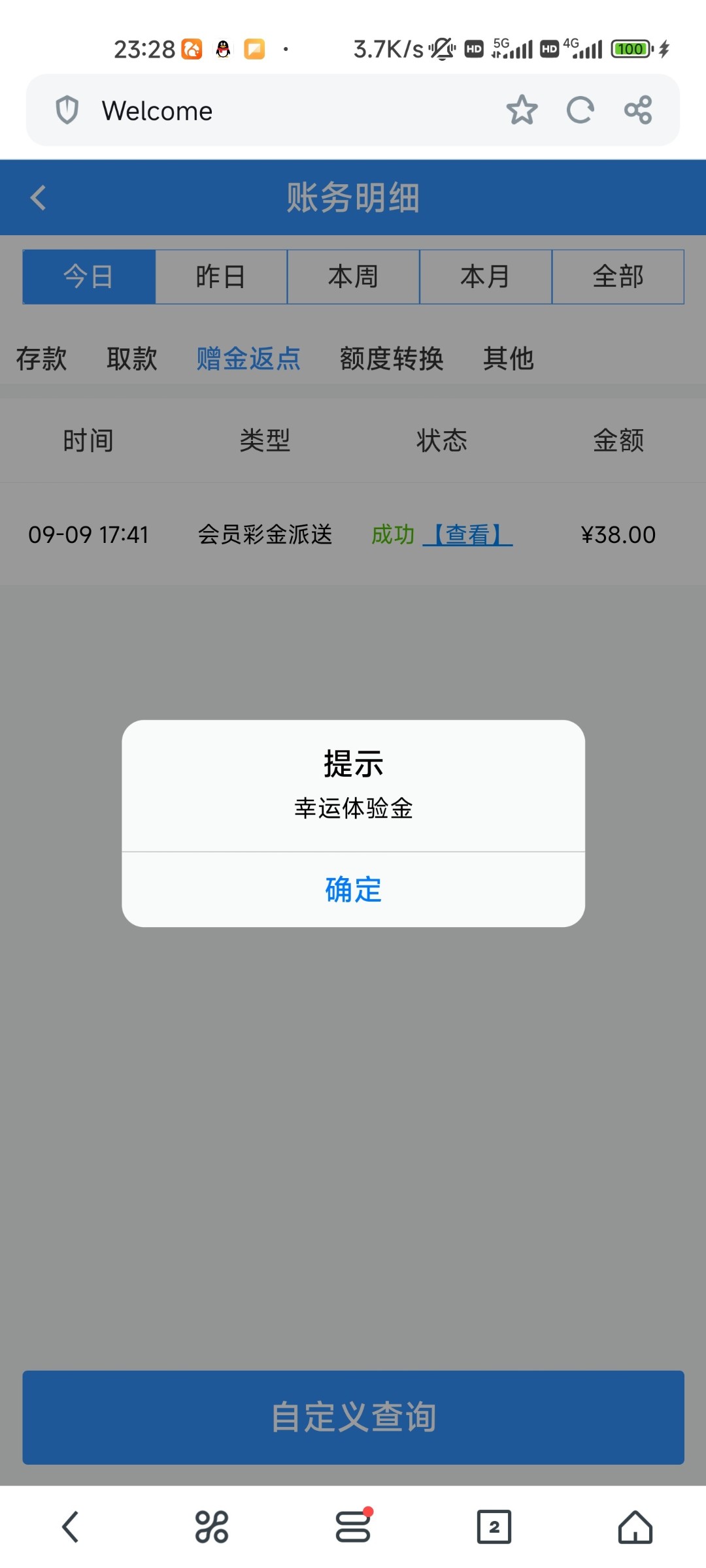 接到电话说送了38彩金,五杯水不限制游戏,我玩的体育,提了两笔,一笔300,一笔500,两笔都是十几分钟到账,大家可以碰瓷试试看