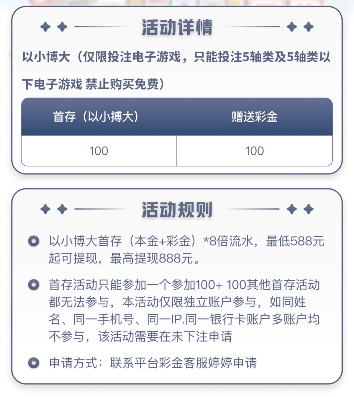 只能娱乐电子游戏,本加彩8倍流水,并且最低588提款,最多到账888,多余清零。