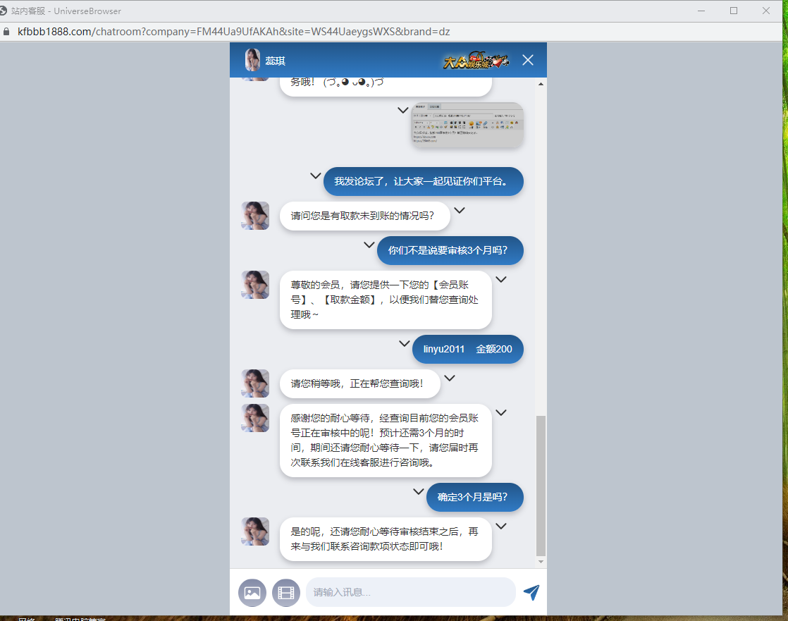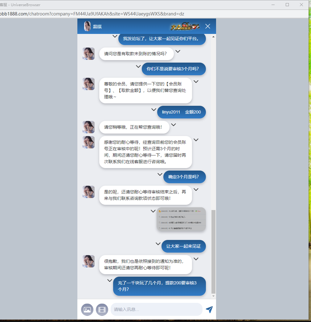 大众娱乐城,赢了不让提款,说审核3个月,3个月后联系又说审核3个月。
