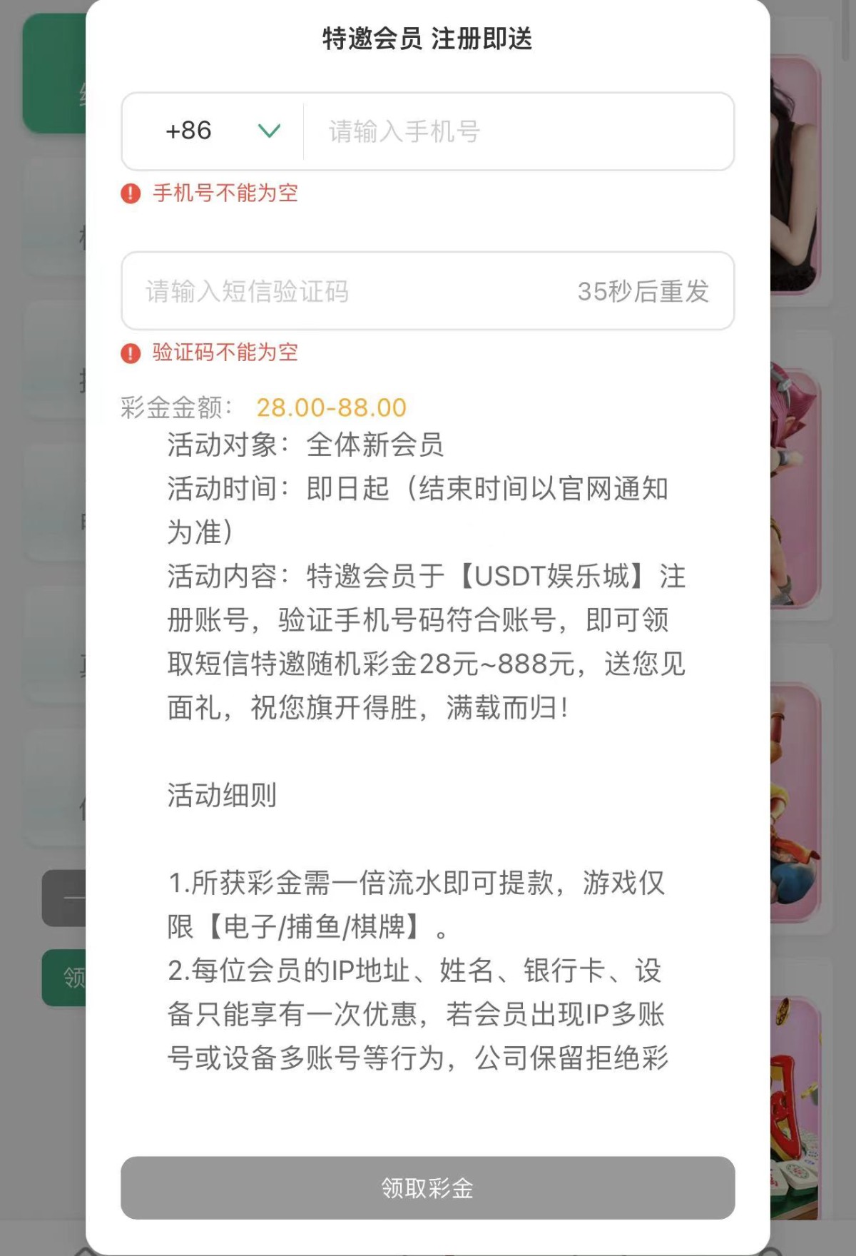 网页注册活动大厅里碰瓷手机号,没有无视。